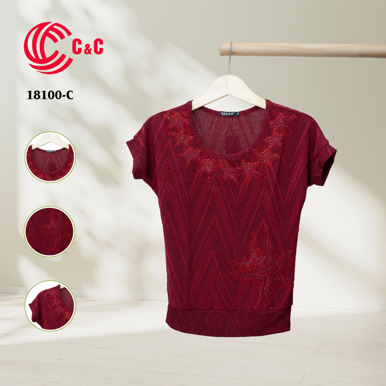- Thêu phối lưới mỏng cách điệu họa tiết hoa lá quanh cổ và ép đá màu tương đồng với màu vải chính, trang trí xung quanh hình thêu tạo điểm nhấn nổi bật và thu hút