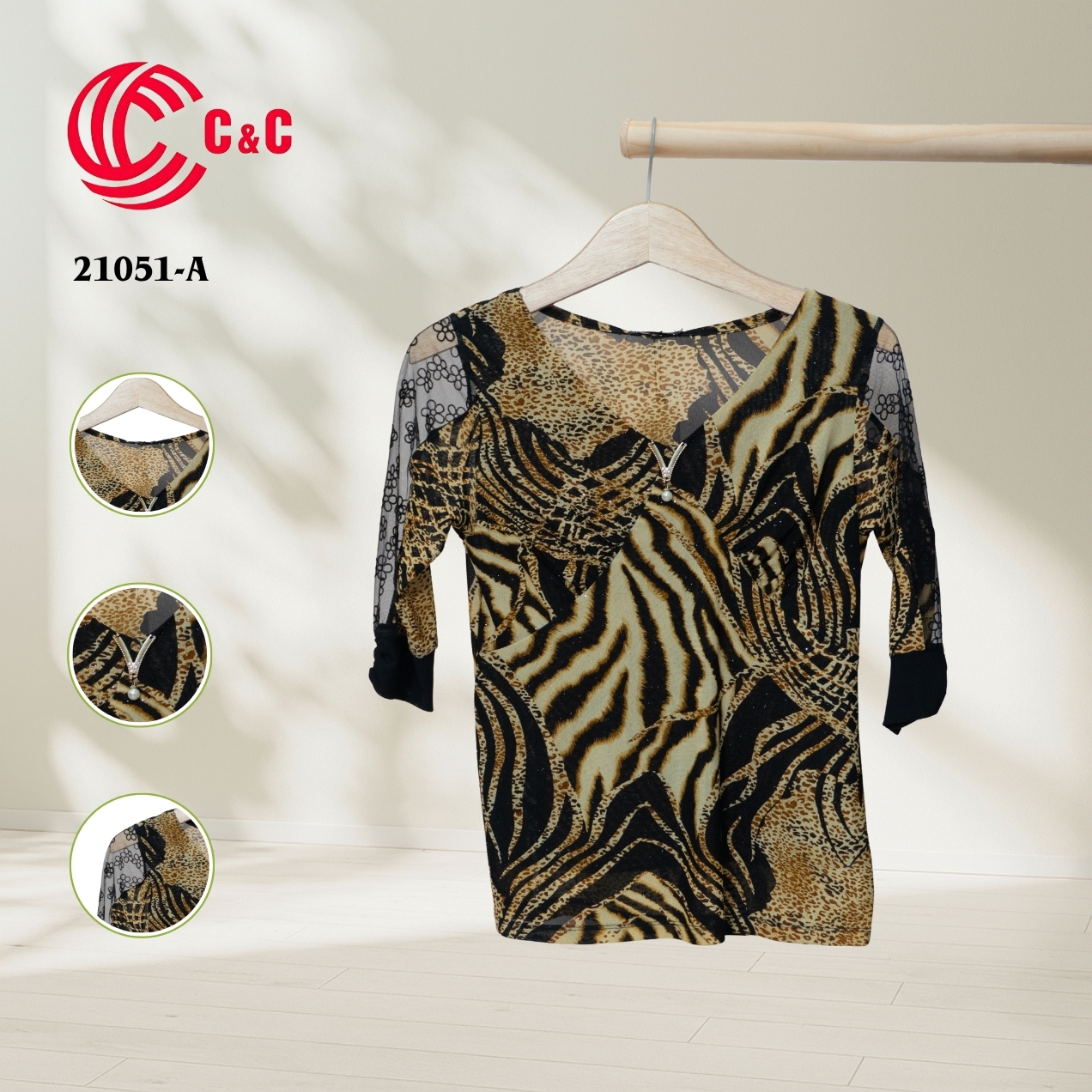 21051 - Cổ chữ V Tay Lỡ Phối Ren Mỏng 3 Họa Tiết 4 Màu