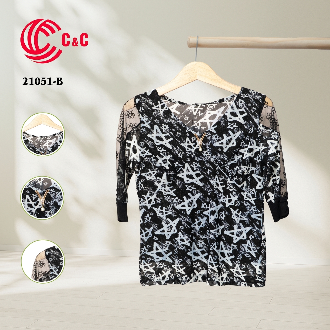 - Tay lỡ phối ren lưới màu đen mỏng, với bo tay bằng vải lưới dẻo 70D màu đen và rút nhúng cửa tay tạo điểm nhấn tinh xảo