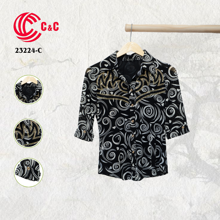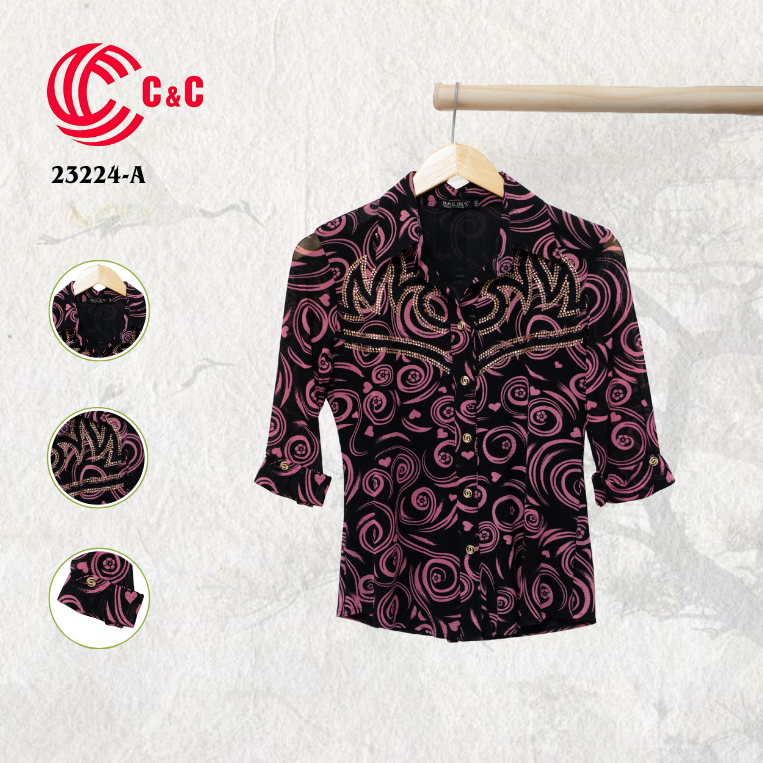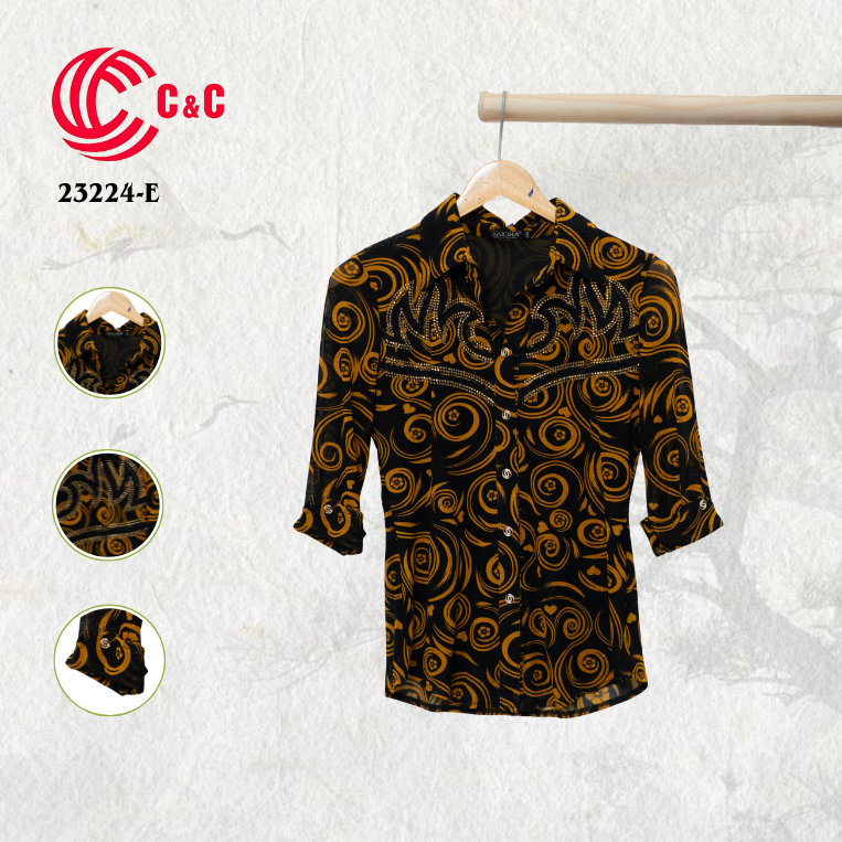 - Vải lưới in họa tiết cao cấp (Polyester Ammonia Knitted Printed Fabric). Họa tiết chủ đạo bao gồm các đường cong uốn lượn và hình dạng ốc xoáy, tạo cảm giác mềm mại và uyển chuyển.