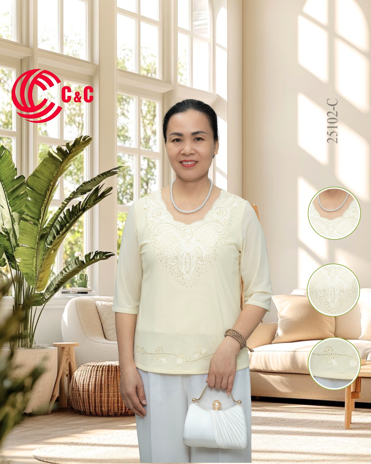 - Cổ áo đắp ren tinh xảo, viền đá thủy tinh lấp lánh, sang trọng mà vẫn hài hòa