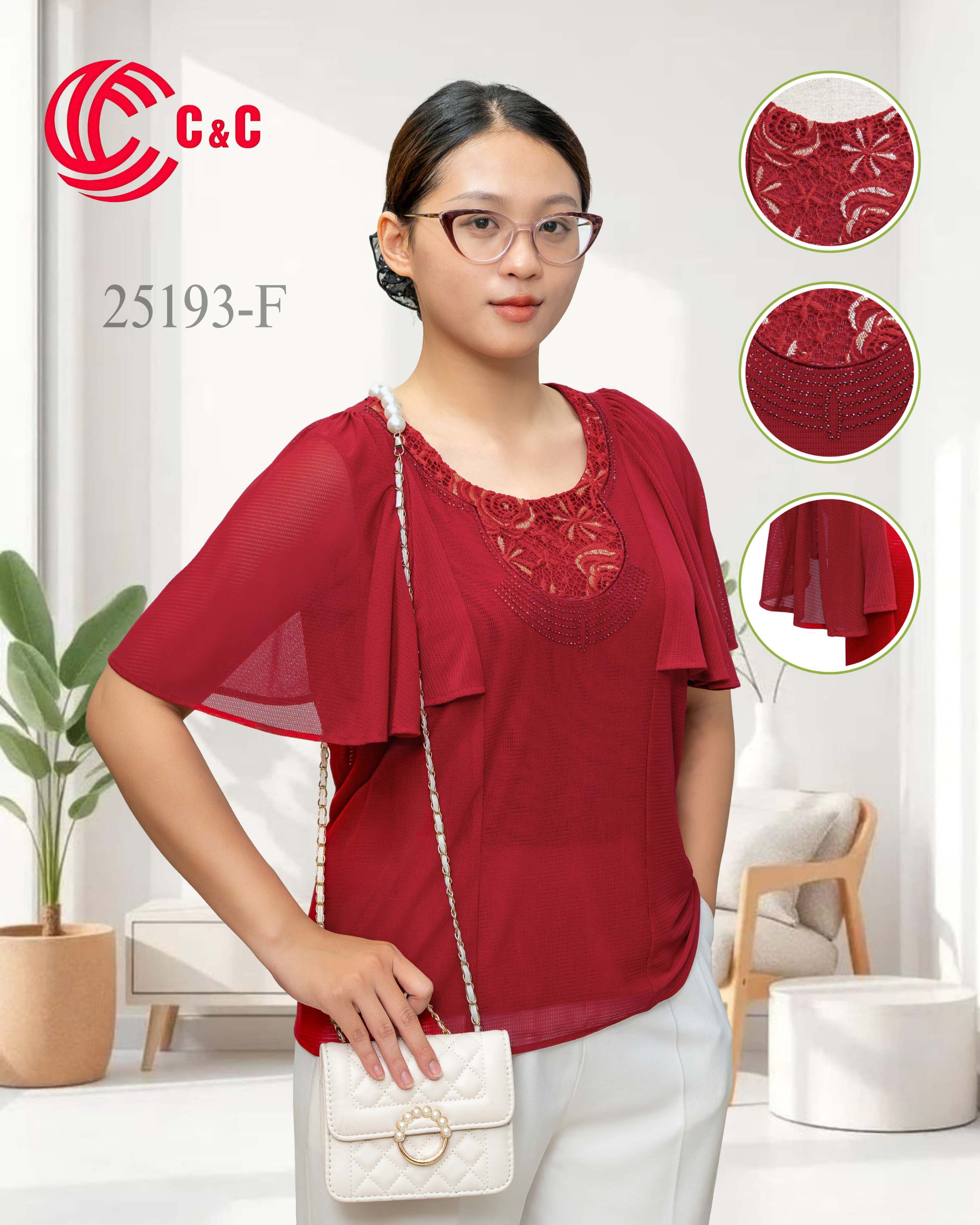 - Phần cổ áo sử dụng vải ren thêu đắp giống cùng tông màu, mang lại chiều sâu và sự tinh tế cho chi tiết trang trí