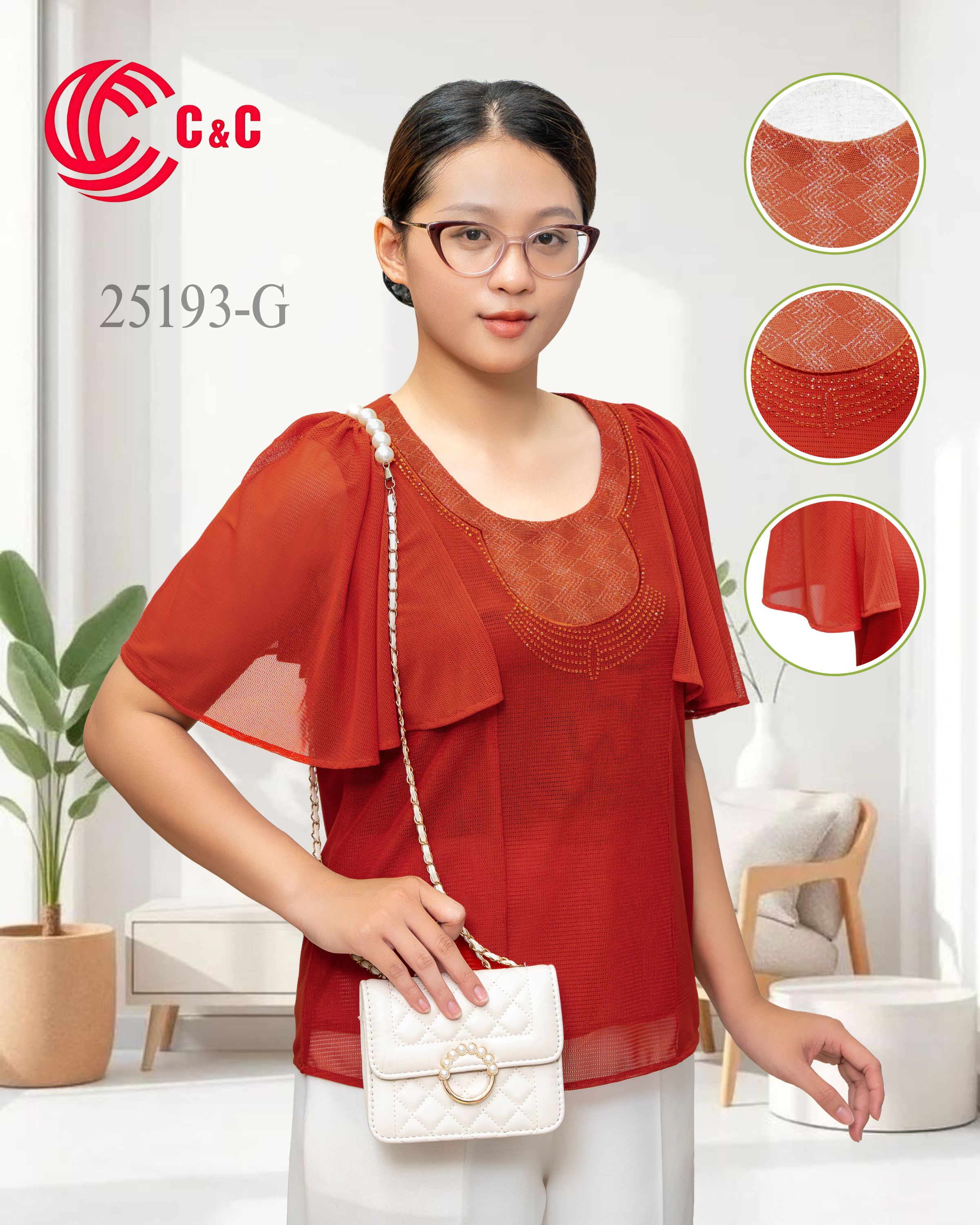 - Xung quanh phần cổ được viền hạt đá thủy tinh cùng tông màu vải, kết hợp với dải đá trang trí phía trước ngực theo đường viền cổ áo, tạo điểm nhấn lấp lánh tinh tế nhưng vẫn giữ được sự sang trọng đặc trưng của thời trang trung niên