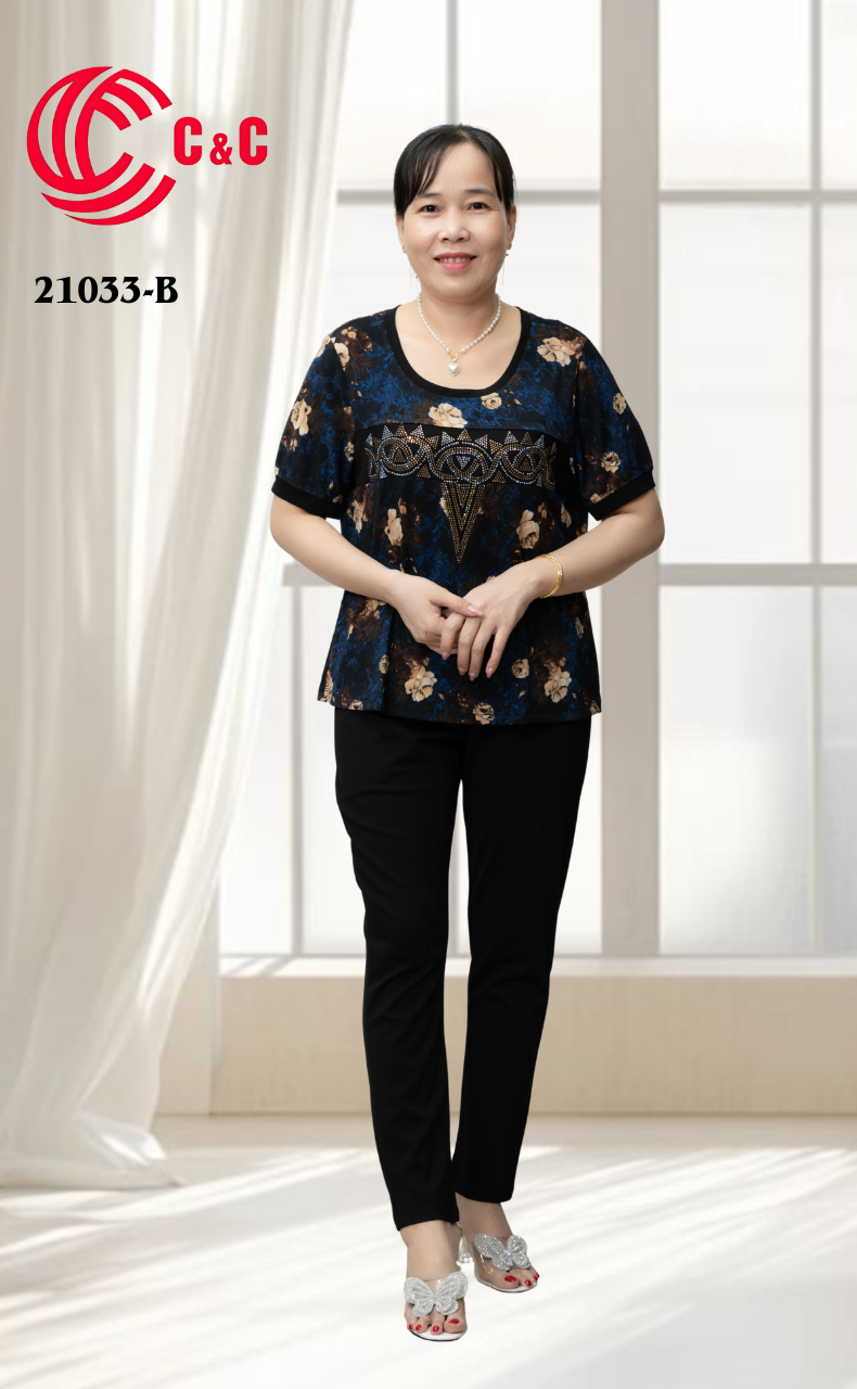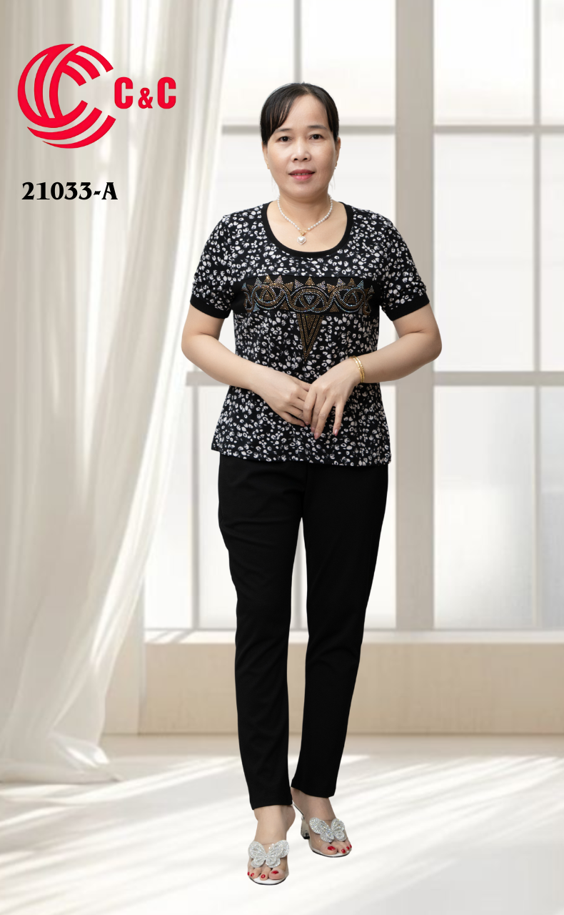 21033 - Áo Tay Ngắn Họa Tiết Phối Ép Đá Thủy Tinh Thêu Cách Điệu